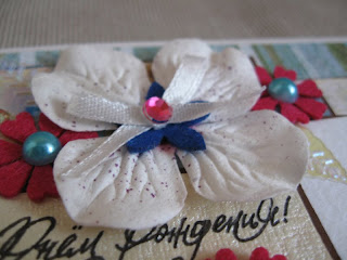 В связи с этим, родилась такая открытка. На неё ушли два листа бумаги Basicgrey, половинки бусин, цветочки Prima и какие-то фетовые цветочки, ленточки. Подсмотрела идею с прошивание открытки, попробовала - понравилось.